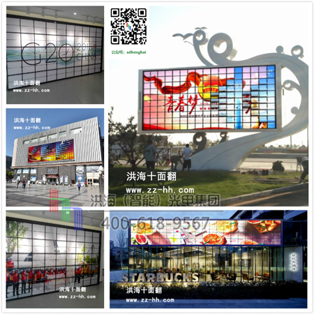 機械翻頁十面翻告別了傳統的機械傳動,取而代之是數控智能控制系統的應用,化腐朽為神奇,以其波瀾壯闊的新奇和動感效果橫空出世,在視覺疲勞中給人以清新、懷舊但又與眾不同的視覺感受。好的元素用于建筑、裝飾、場館、舞臺和戶外廣告,讓建筑動起來,就會賦予靈魂和創意,帶來更多價值。   創意無止境,廣告無邊界,洪海光電集團帶您進入時尚廣告前沿,來吧朋友們,與洪海共舞,打造您的財富空間!!!